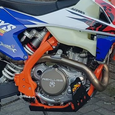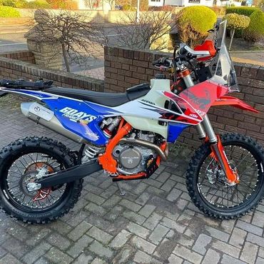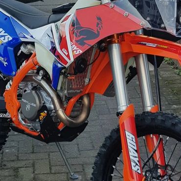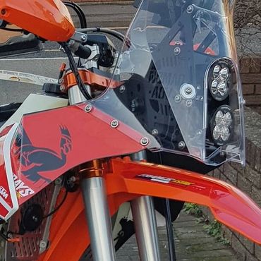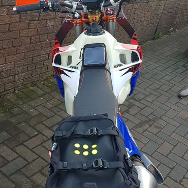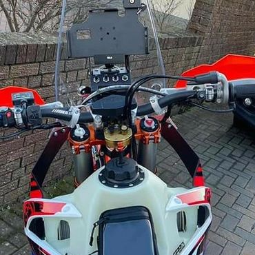 The Gallic Rooster 500 EXC French Six Days. This beauty of a bike was built using the Nomad ADV tower kit. Full suspension re-spring and re-valve, AXP racing bashplate, Polisport swingarm guards, AS3 performance rear disc guard and clutch slave protector plus footpegs. Rekluse clutch case cover and triple clamp ignition cover, Artafon radiator guards, ET Racing steering damper kit and key ignition kit. Custom french six days decals, KTM hand guards, KTM wheel bearing protecter covers. Kreiga OS6 rear bag and rack loops. Enduro pro seat pouch, Baja lights and Brodit powered mount for Samsung Galaxy Tab Active 2. 15Ltr Acerbis large fuel tank. Oxford heated grips. Seat Concepts comfort seat.